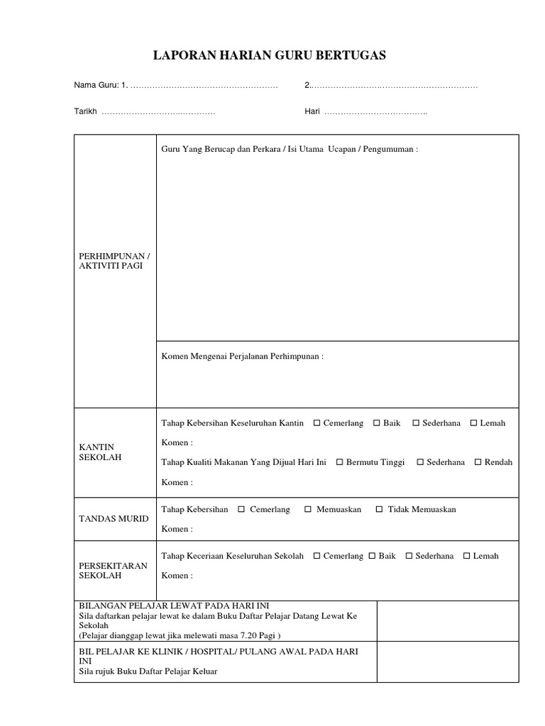 Membuat laporan di dalam Buku Laporan Bertugas yang disediakan dan kalau perlu laporkan terus kepada Guru Besar supaya tindakan segera dapat diambil. Borang guru bertugas Adeq Norzuani. Terdapat pelbagai pengisian dan catatan yang boleh disunting melalui fail yang kami kongsikan ini.