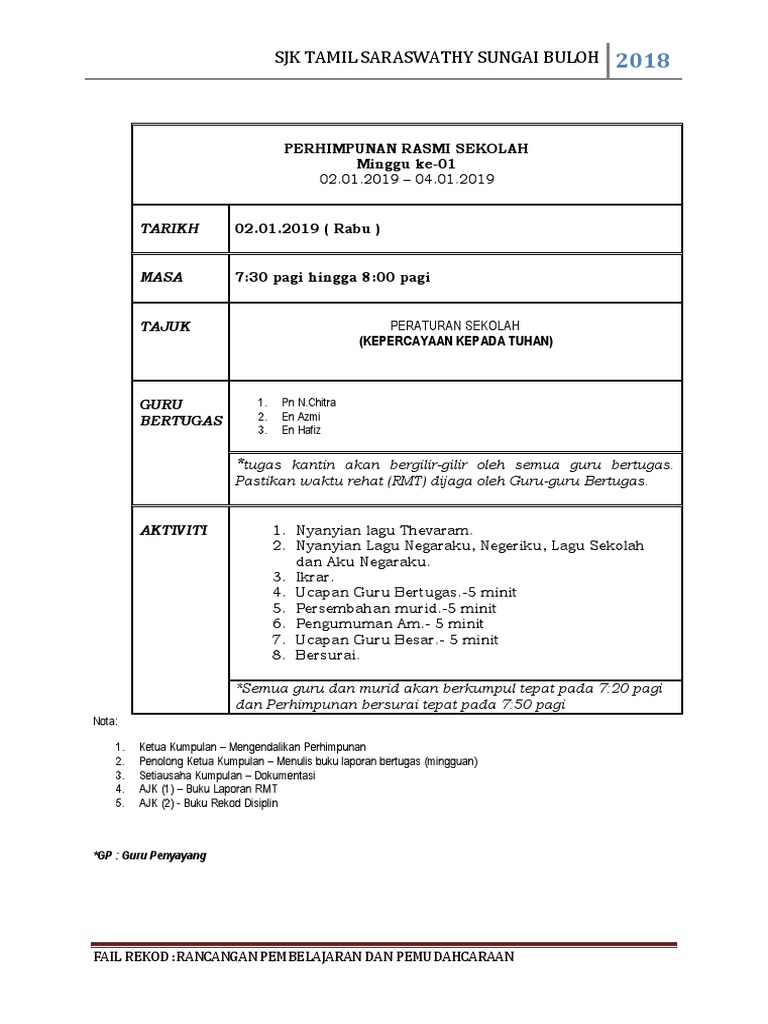 Mengumpulkan rancangan tahunan dan buku aktiviti untuk edaran rujukan dan rekod. Perhimpunan 131 Memastikan semua guru menghadiri perhimpunan. Menguruskan perhimpunan pagi sesi pagi perhimpunan tengah hari sesi petang.